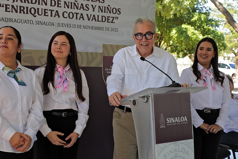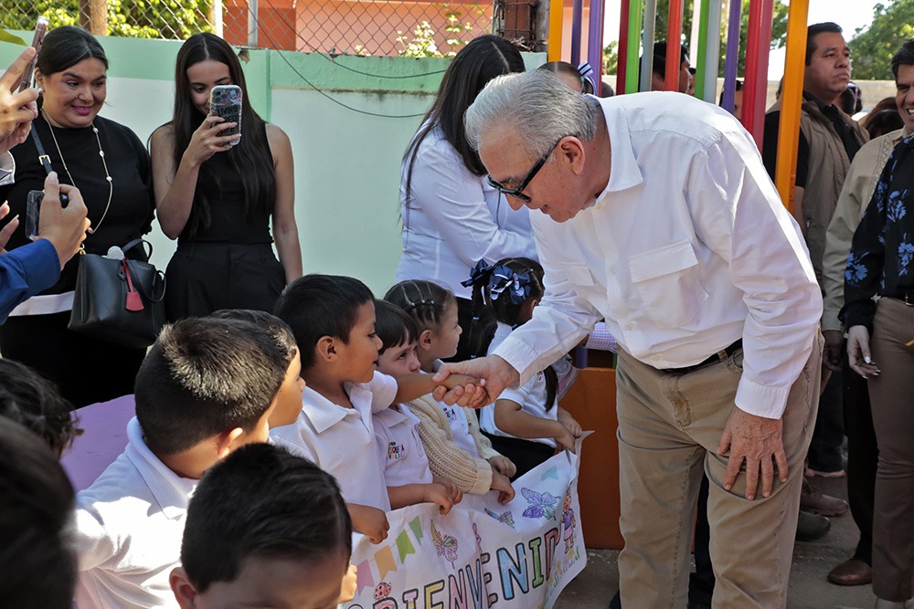 BADIRAGUATO, Sin.- “Nos da gusto entregar esta escuela, que en realidad no está rehabilitada, porque las aulas que había se tumbaron y es importante que ahora tienen estas tres aulas nuevas, que están en condiciones de ser habitadas en el proceso educativo por las niñas y los niños de este jardín de niños”, señaló complacido el gobernador Rubén Rocha Moya al visitar esta mañana el jardín de niños de esta cabecera municipal.
