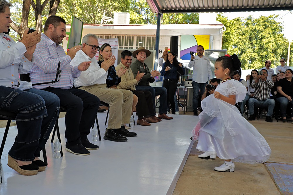 Durante la reunión con la comunidad escolar de este Jardín de Niños, el gobernador Rocha disfrutó de la presentación de un gracioso bailable a cargo de una de las niñas, y recibió también obsequios que le hicieron los padres de familia, como muestra de gratitud.