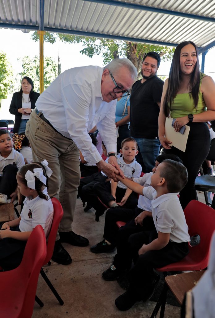 El mandatario estatal dialogó con todos las niñas y niños del Jardín de Niños “Profesora Enriqueta Cota Valdez”, así también con los docentes a quienes les entregó enseres de cocina para el programa de desayunos calientes, obras y mobiliario en las que se invirtieron 4 millones 100 mil pesos.