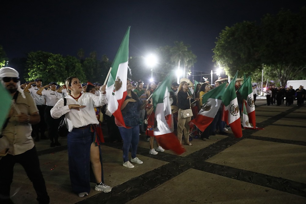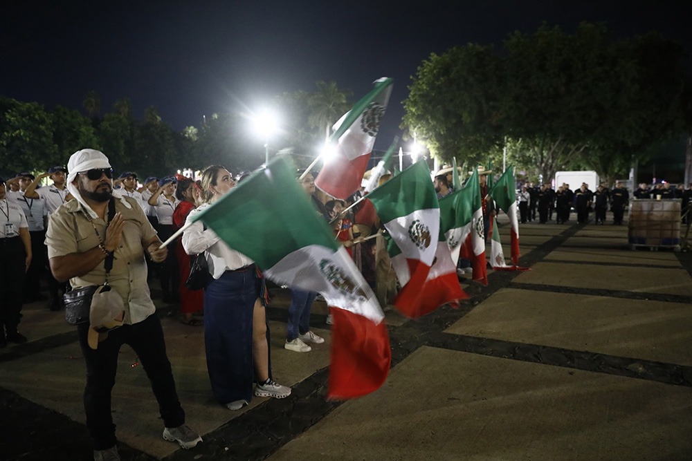 “Mexicanas, mexicanos, sinaloenses; Vivan las heroínas y los héroes que nos dieron patria e independencia, Viva Hidalgo, Viva Morelos, Viva doña Josefa Ortiz Téllez Girón, Viva Allende, Viva Aldama, Viva Guerrero, Viva doña Leona Vicario, Viva la Independencia Nacional, Viva la Cuarta Transformación, Viva la presidenta Claudia Sheinbaum Pardo, Viva México, Viva México, Viva México, Viva Sinaloa”, dijo a todo pulmón el mandatario estatal, para enseguida con bandera en mano repicar la campana del balcón principal.