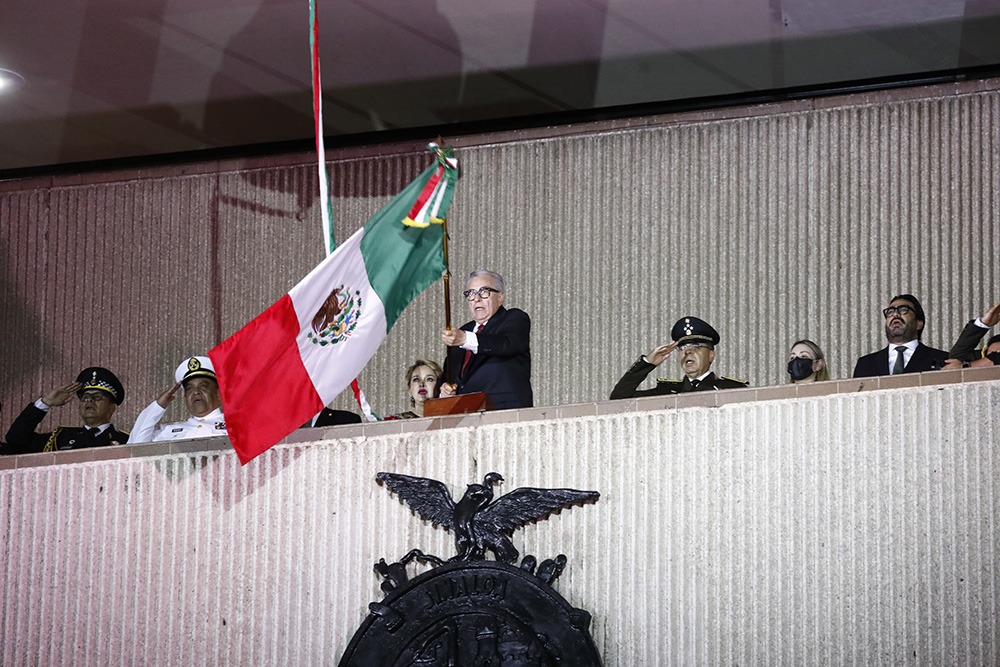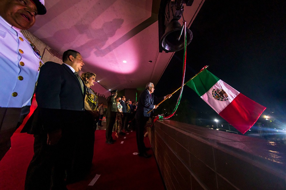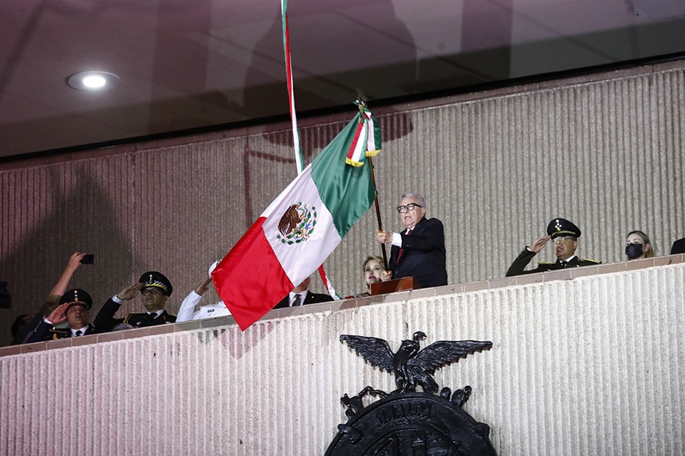 En un solemne acto protocolario, el gobernador Rubén Rocha Moya conmemoró el 215 aniversario del Grito de Independencia, y como cada año, desde el balcón principal de Palacio de Gobierno, ondeó en su diestra la bandera nacional para recordar y vitorear a los héroes que nos dieron patria y libertad, para enseguida repicar la gigantesca campana que luce en el balcón.