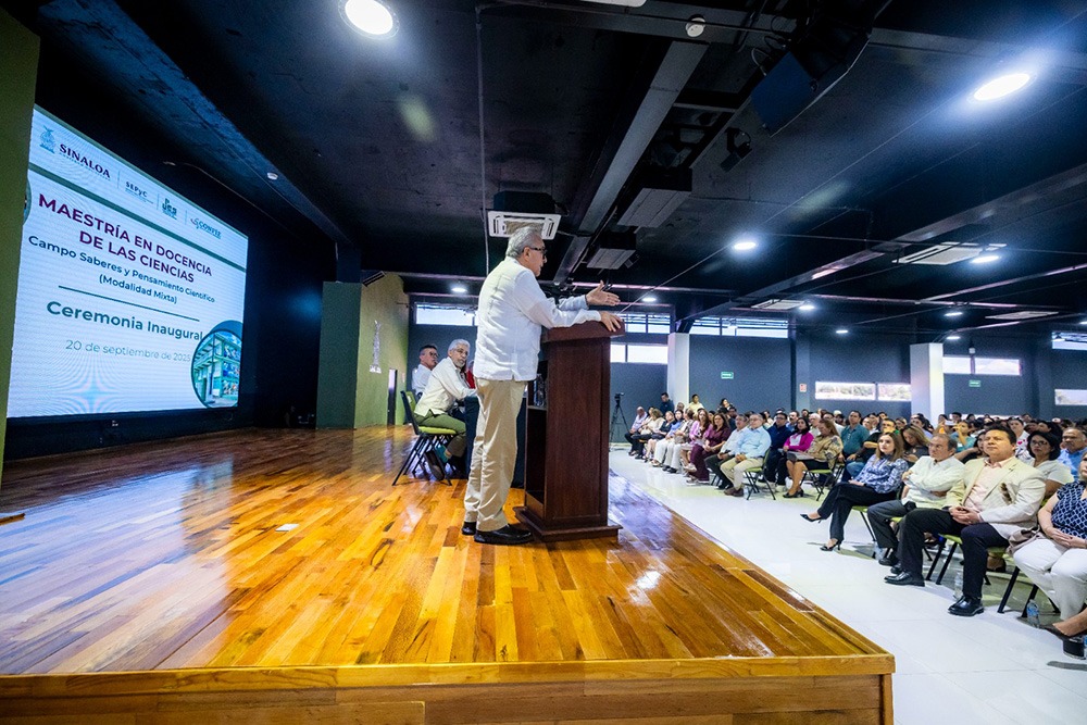 La Maestría en Docencia está encaminada a la excelencia de la Educación Básica, señaló el gobernador Rubén Rocha Moya al inaugura esta mañana la maestría Docencia de las Ciencias, Campo Saberes y Pensamiento Científico, que será impartida por la Universidad Pedagógica del Estado de Sinaloa.