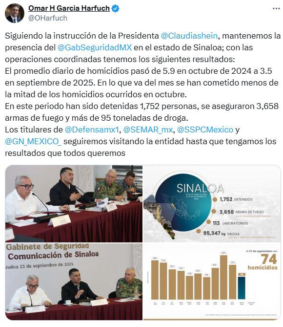 A pregunta expresa sobre los avances que se tienen, el mandatario estatal respondió que de acuerdo al informe presentado en esta reunión por el secretario García Harfuch, se tiene una disminución de delitos de alto impacto tanto en el país como en Sinaloa en particular.