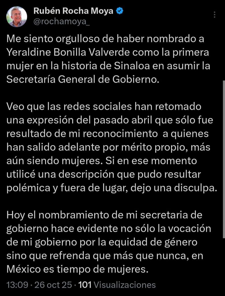 En sus redes sociales el gobernador de Sinaloa fue contundente al decir que está orgulloso de haber nombrado a Yeraldine Bonilla como su Secretaria General de Gobierno y rompe paradigmas ya que es la primera mujer que ocupa este cargo dentro de un Gobierno del Estado.