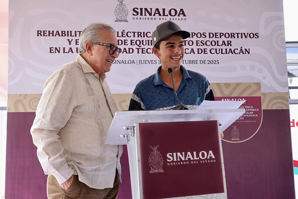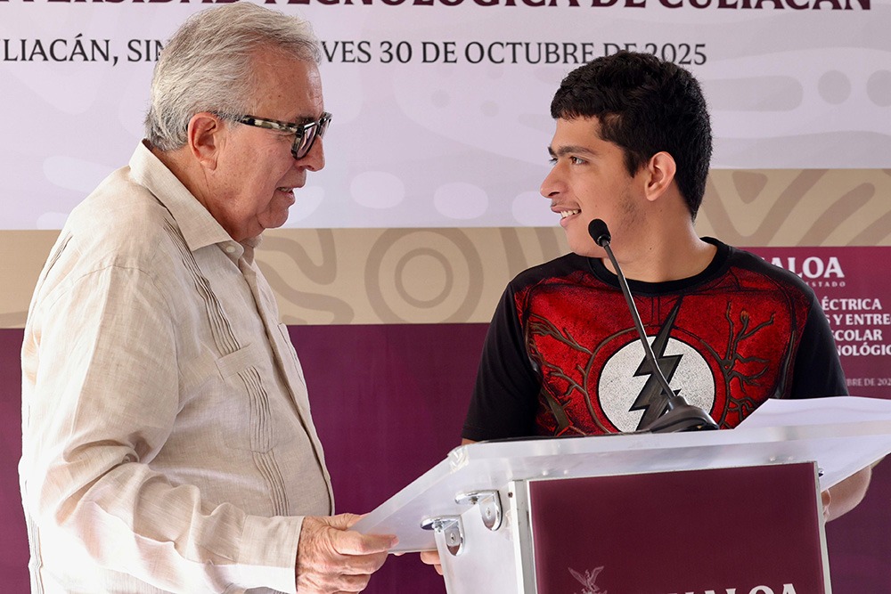 A nombre de los estudiantes, hizo uso de la voz la joven Cristina Bustos Benítez, alumna de la carrera de Ingeniería en Agricultura Sustentable y Protegida. “Gracias a este apoyo nosotros los estudiantes podemos aprender con herramientas reales, desarrollar competencias profesionales y contribuir de manera más eficiente al crecimiento de la sociedad. Doctor Rubén Rocha Moya reciba de parte de toda nuestra comunidad universitaria nuestro más sincero agradecimiento y reconocimiento por impulsar la tecnología, la innovación hacia una educación de calidad”.