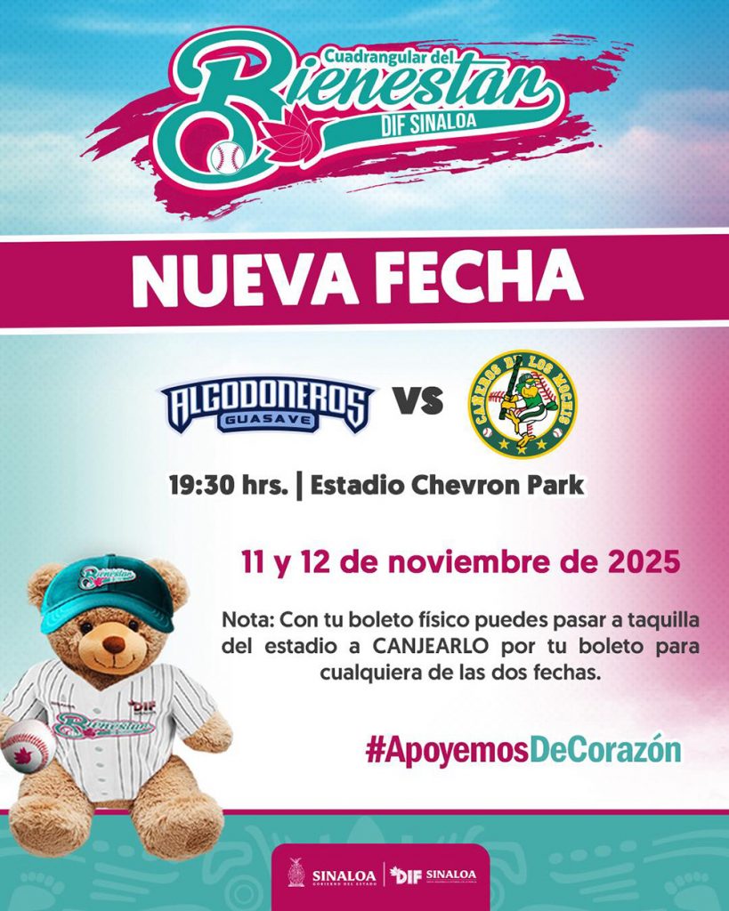Los cañeros de Los Mochis estarán recibiendo a los Algodoneros de Guasave en el estadio Chevron Park a las 19:30 horas. Es importante aclarar que las personas que compraron su boleto para el Cuadrangular del Bienestar podrán pasar a la taquilla del estadio para canjearlo por su boleto oficial para cualquiera de las fechas y juntas y juntos vivamos la emoción del béisbol y apoyemos de corazón a las niñas, niños y adolescentes que requieren de un trasplante de riñón.