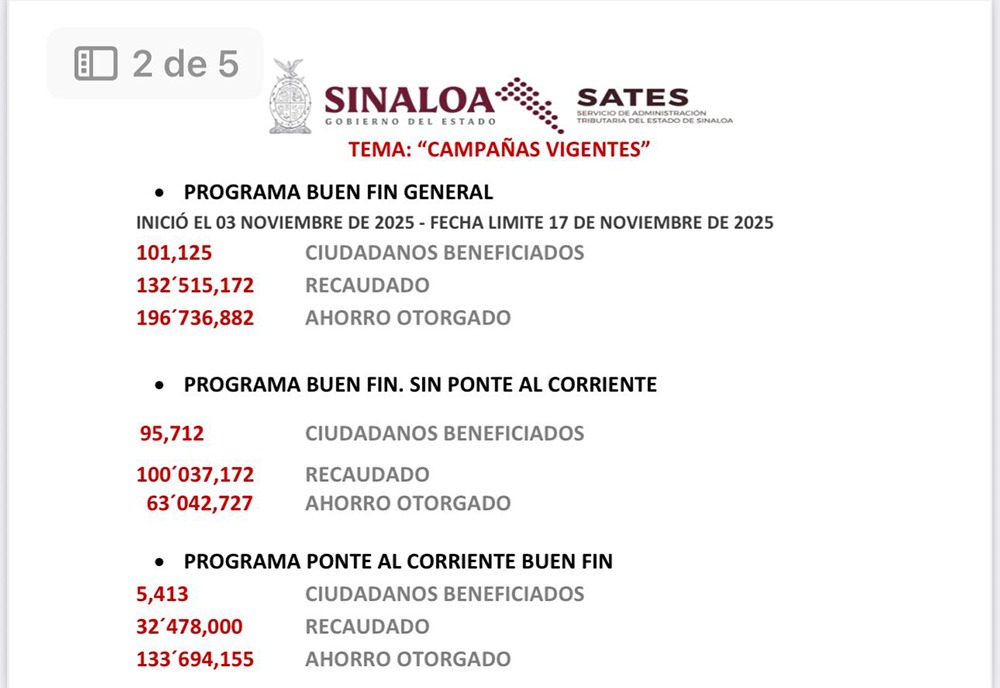 Señaló que este programa inició el día 3 de noviembre y culminado en 17 de noviembre y en esta fecha se beneficiaron 101 mil 125 ciudadanos, quienes tuvieron un ahorro de 196 millones 736 mil 882 pesos y se recaudaron 132 millones 515 mil 172 pesos.