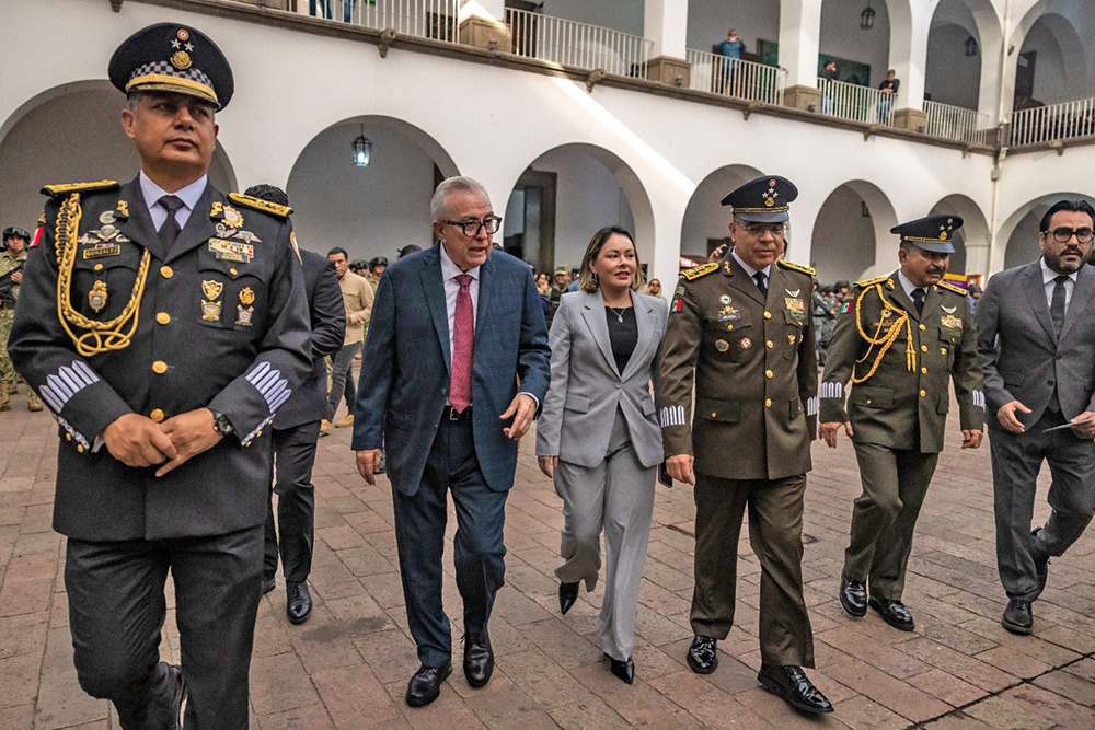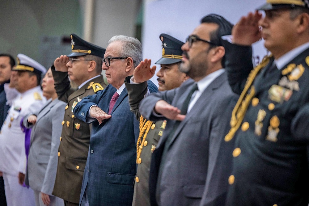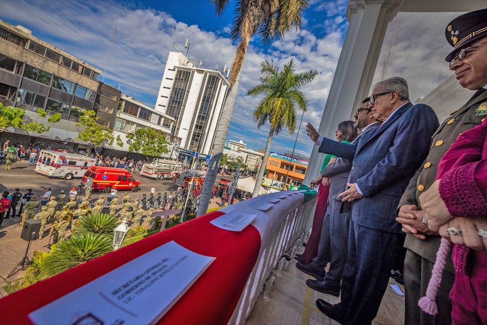 Para esta solemne ceremonia, que se realiza cada 20 de noviembre, el gobernador Rocha estuvo acompañado por la secretaria general de Gobierno, Yeraldine Bonilla Valverde; por el comandante de la Novena Zona Militar, General de Brigada, Santos Gerardo Soto; por el presidente del Supremo Tribunal de Justicia, magistrado Jesús Iván Chávez Rangel; por el presidente de la Mesa Directiva del Congreso del Estado, diputado Rodolfo Valenzuela Sánchez; por el Vicealmirante Sergio Reyes Rodríguez, inspector de la Cuarta Región Naval; por el General de Brigada Ulises Julián Tadeo González Calzada, coordinador estatal de la Guardia Nacional en Sinaloa; y como anfitrión, el presidente municipal de Culiacán, Juan de Dios Gámez Mendívil.