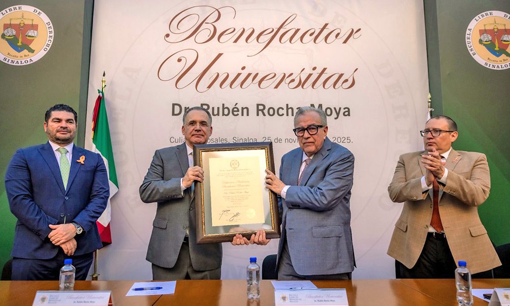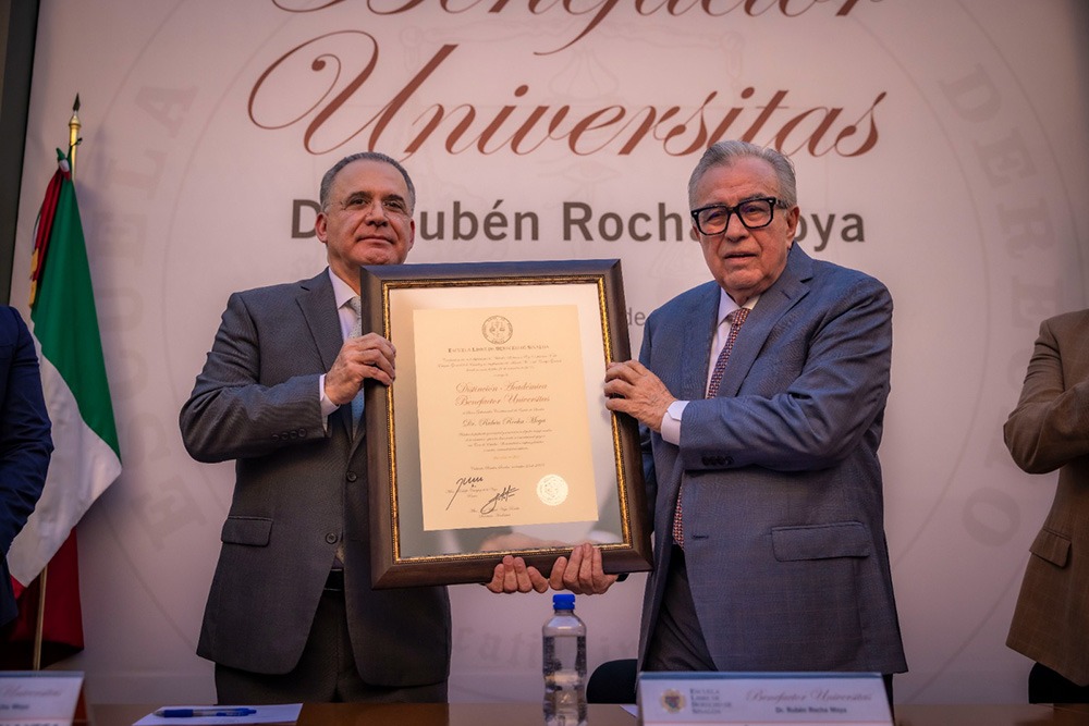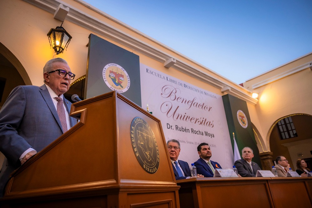 En reconocimiento por el apoyo otorgado a la Escuela Libre de Derecho de Sinaloa, dicha institución de educación superior otorgó al gobernador Rubén Rocha Moya la distinción académica “Benefactor Universitas”, en una sesión solemne de su Consejo General, donde el mandatario estatal recibió una placa de reconocimiento y le fue colocado un pin distintivo, frente a la comunidad universitaria.