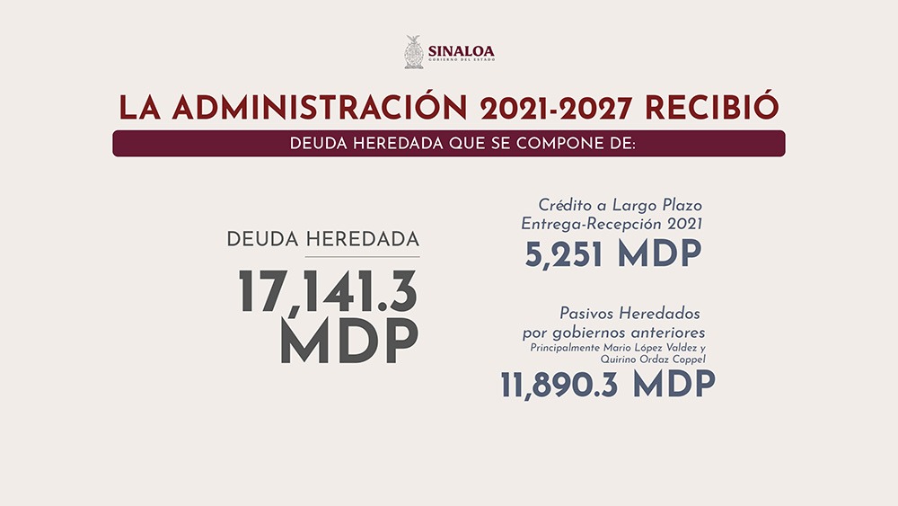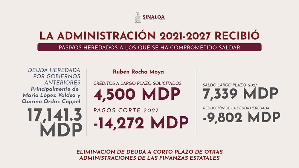 Los ex es que gobernadores y Quirino Ordaz Coppel Mario López Valdez nos brindaron una deuda por usar 17 mil 141.3 millones de pesos señaló categórico el gobernador Rubén Rocha Moya y dijo que, a pesar de todo ello, su gobierno ha cumplido con el pago de pensiones y el fondo de vivienda a los trabajadores.