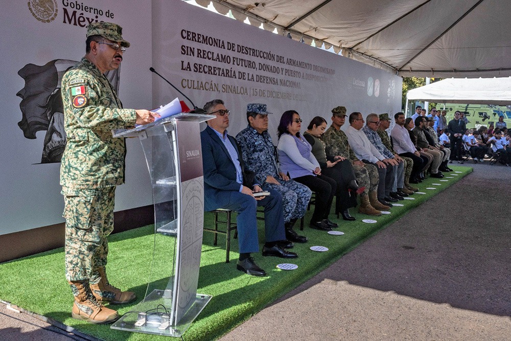 “Las armas que hoy serán inutilizadas son el resultado del trabajo firme y constante de las Fuerzas Armadas, en conjunto con las fiscalías e instituciones de seguridad pública como la Guardia Nacional, las policías estatales y municipales en su lucha contra la delincuencia y en la preservación del orden y la justicia. Su aseguramiento representa la acción decidida y coordinada de los gobiernos de la república, del estado de Sinaloa y del municipio de Culiacán para restablecer la tranquilidad y organizar el estado de derecho en cada rincón de nuestro país”, afirmó el comandante de la Novena Zona Militar.