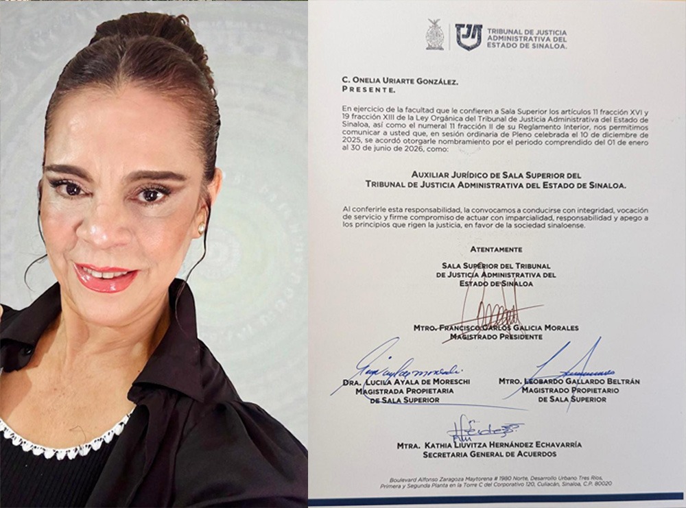 DESDE ESTE espacio felicitamos a nuestra amiga la Lic. Onelia Uriarte por su reciente nombramiento como Auxiliar Jurídico de la Sala Superior del Tribunal de Justicia Administrativa del Estado de Sinaloa.