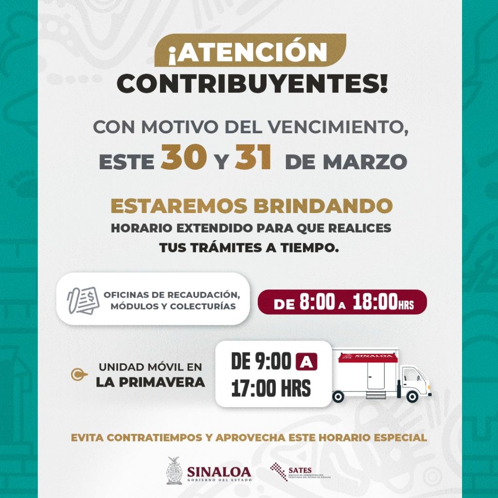 Con el objetivo de brindar mayores facilidades a las y los contribuyentes ante el próximo vencimiento de trámites, el Servicio de Administración Tributaria del Estado de Sinaloa (SATES) informo a través de la Directora de Recaudación del Estado, Lic. Karina Gutiérrez Dautt que: “Los días 30 y 31 de marzo se implementará un horario extendido de atención en todo el estado.”