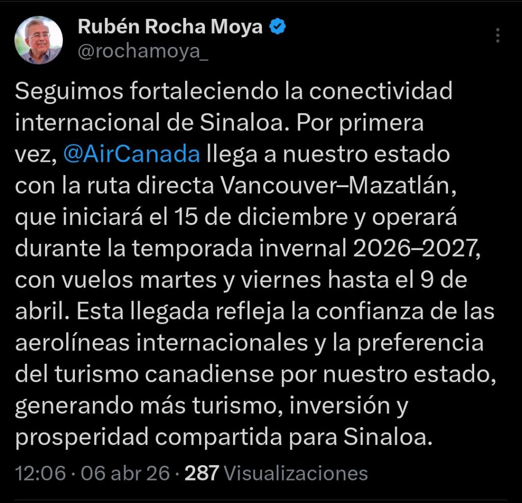 A través de sus redes sociales el mandatario sinaloense se congratuló con esta nueva ruta directa desde Vancouver que iniciará sus operaciones durante la temporada invernal 2026-2027.