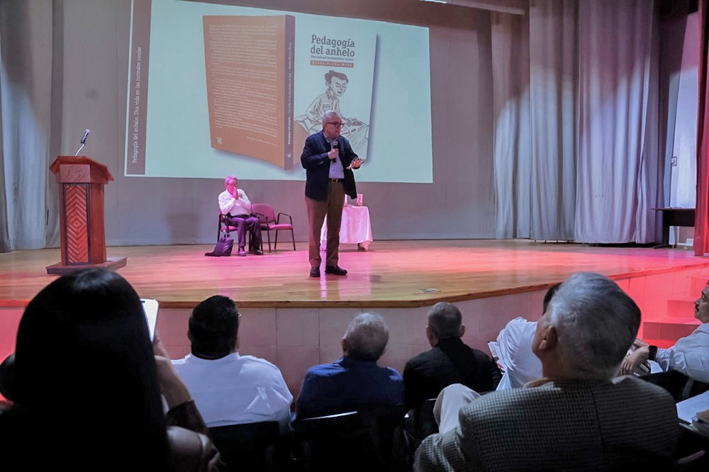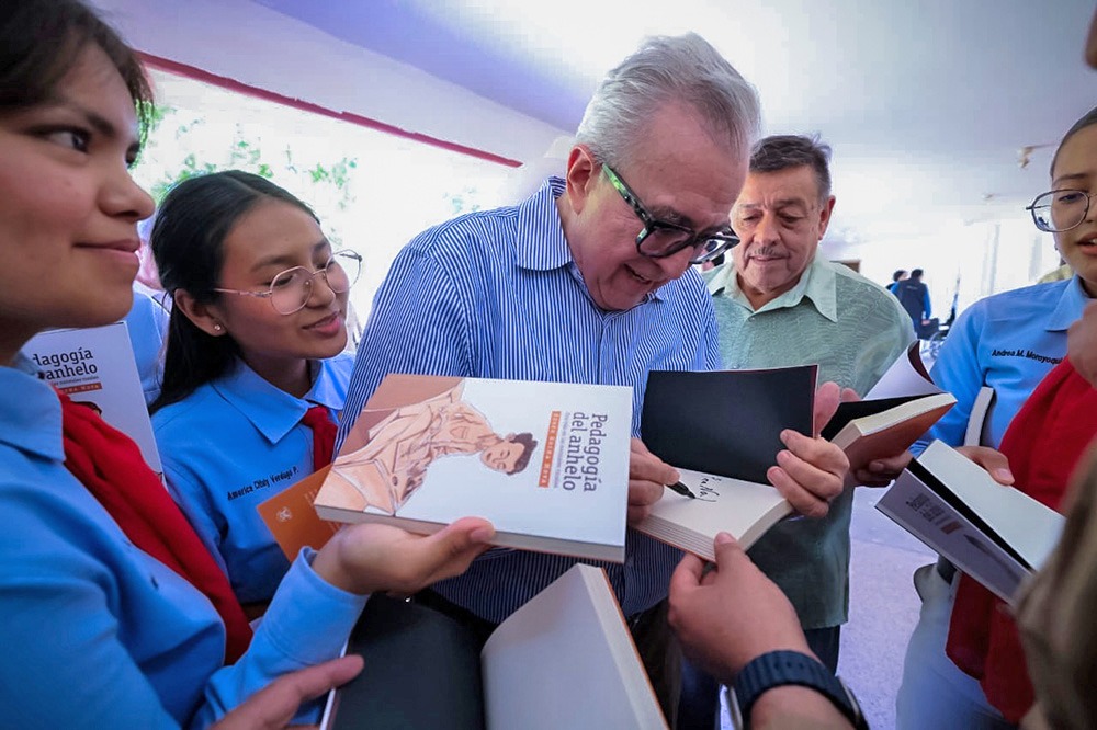 El gobernador Rocha aprovechó su visita para presentar su libro “Pedagogía del Anhelo. Una Vida en las Normales Rurales”.